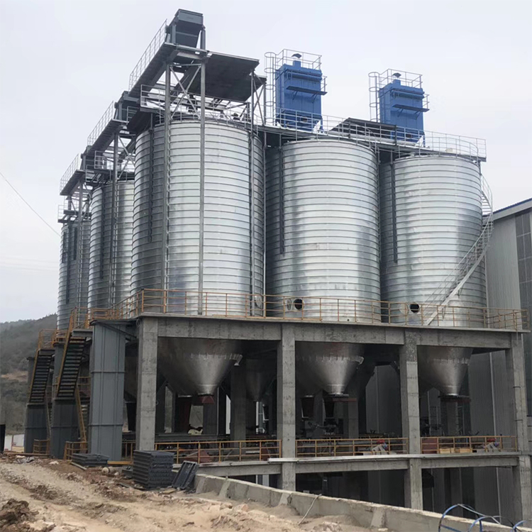 接收与清理设置在筒仓中央该形式筒仓一般采用对称排列,提升机井架固定,经过提升后的物料通过仓顶溜管进人筒仓。这种形式省去了仓顶输送设备和上通廊,从而节省了建造费用,缩短了建造工期。对于贮存时间要求较长的大型粮库,则应根据物料的流向、场地情况、工艺要求等合理地配置投料口、工作塔、烘干塔及宿州钢板仓的位置。国华钢板仓介绍了这几种常见的进料形式,实际中可将各种形式相互组合,相互渗透,根据实际情况合理搭配,灵活选用。